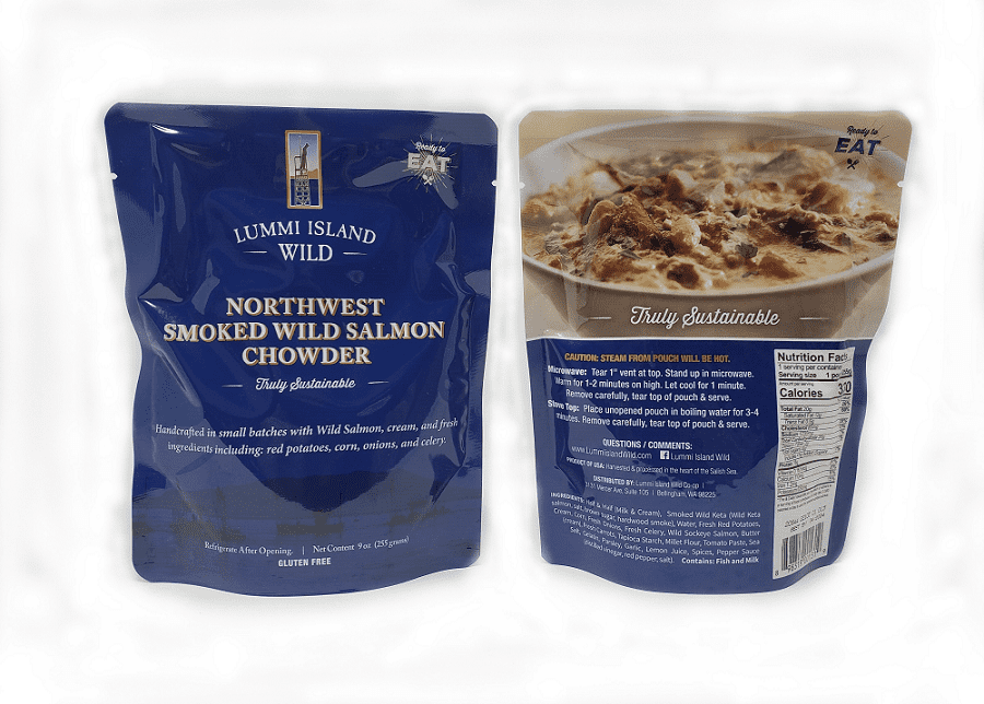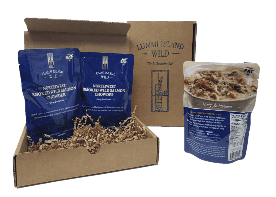 Customers who order salmon chowder from Lummi Island Wild say it’s among the best they’ve tried. Chowder can be purchased in packages of 5 or 10 pouches. One pouch is 9 ounces, or a perfect single serving.
